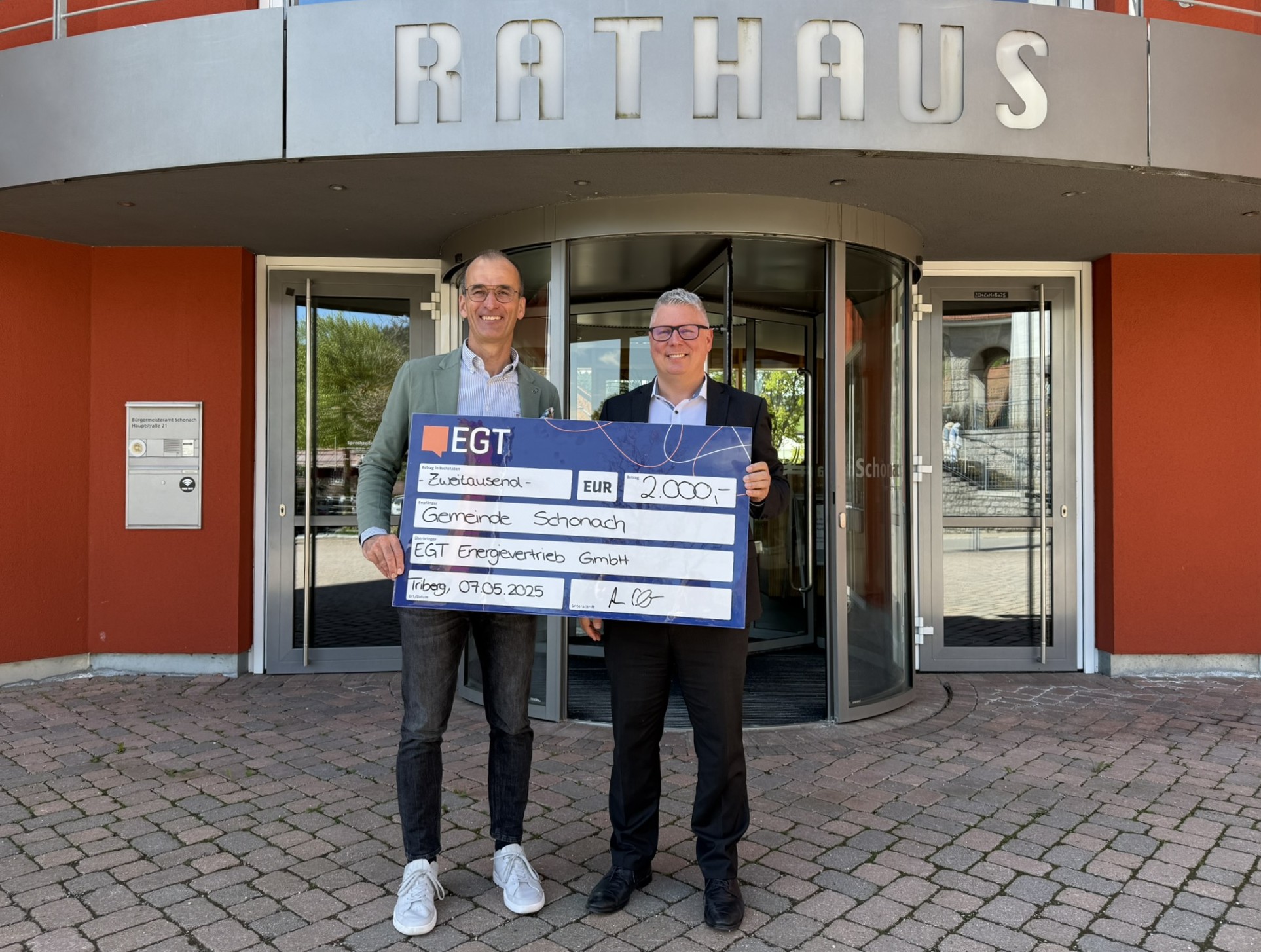 Die Gemeinde Schonach freut sich über eine Zuwendung in Höhe von 2.000 Euro aus der EGT Regio Prämie. Mit diesen Mitteln unterstützt die EGT Energievertrieb GmbH gezielt regionale Projekte und Initiativen in ihrem Netzgebiet. In Schonach kommt die Prämie einem besonderen Anlass zugute: der Gründung der ersten offiziellen Städtepartnerschaft der Gemeinde – mit der französischen Gemeinde Plescop in der Bretagne.