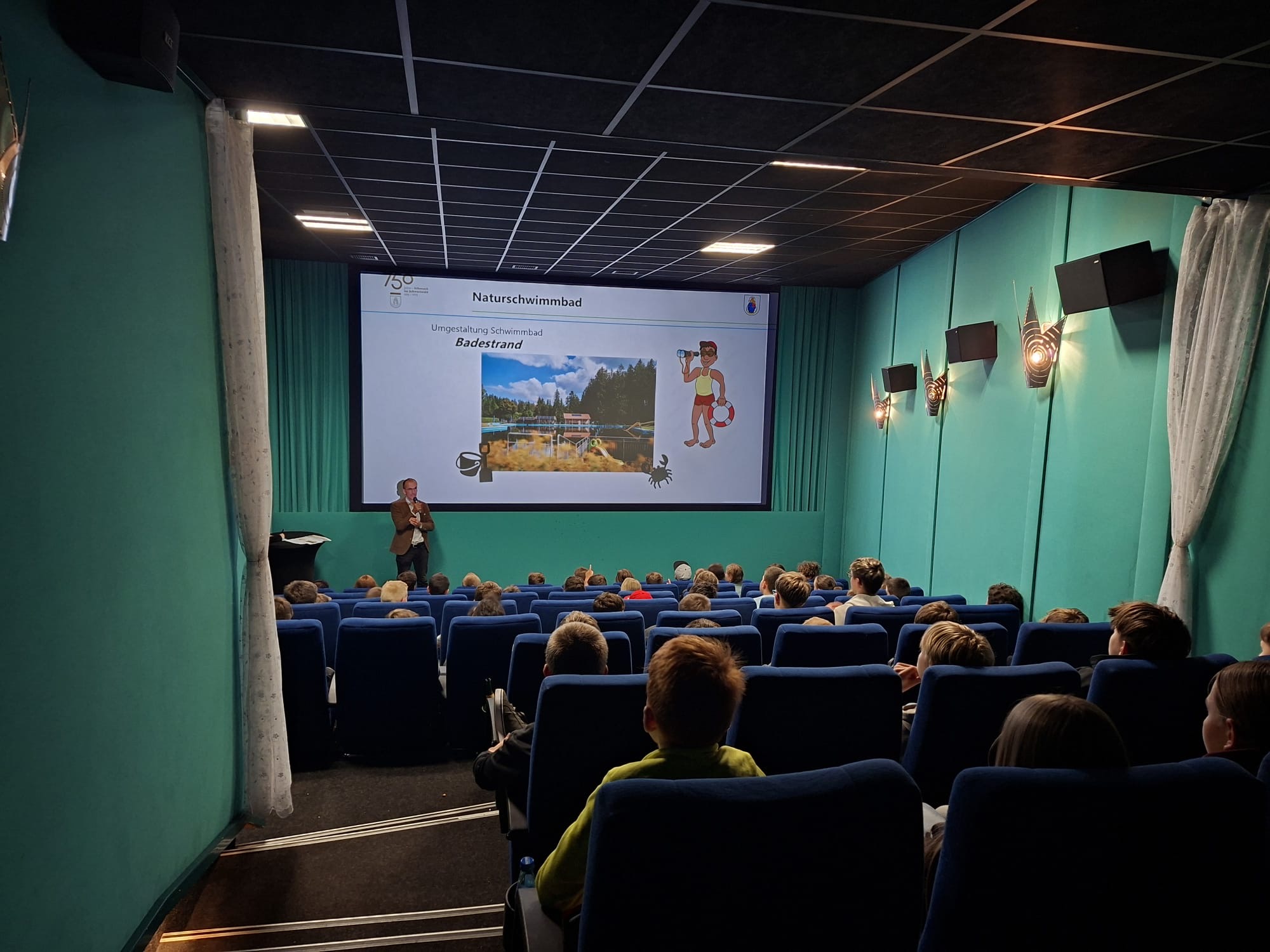 Zum Start gab es im Kinosaal Popcorn, Getränke und einen spannenden „Die drei ???“-Film – ein Auftakt, der bei allen super ankam. Danach wurde es ernst: Zunächst wollten die Kinder und Jugendlichen wissen, was aus den Anregungen des letzten Jugendhearings geworden sei. Bürgermeister Jörg Frey erklärte, dass die Anregungen dem Gemeinderat vorgestellt und – soweit möglich – bereits umgesetzt wurden.